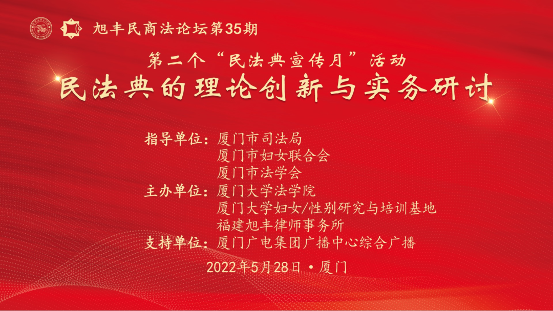 正值《中华人民共和国民法典》颁行两周年之际,为响应中宣部、司法部等部门关于组织开展第二个“民法典宣传月”活动的号召,2022年5月28日,厦门大学法学院、厦门大学妇女/性别研究与培训基地联合福建旭丰律师事务所共同举办了“民法典的理论创新与实务研讨”会。厦门大学党委常务副书记林东伟,厦门市司法局党组书记、局长丁贤志,厦门市司法局党组成员、副局长李明哲,厦门市法学会党组成员、副会长李包明,厦门市妇女联合会权益部部长胡艺芬,厦门大学法学院副院长、郑晓剑教授等领导出席本次论坛,厦门大学法学院民商法学科老师和研究生以及厦门法律界的诸多专业人士到现场参会。本次活动得到了厦门市司法局、厦门市妇女联合会、厦门市法学会的指导,厦门广电集团广播中心综合广播、海丝中央法务区云平台支持传播。会议在厦门翔业大厦11楼旭丰所会议中心举行。