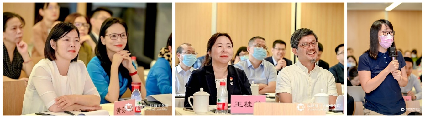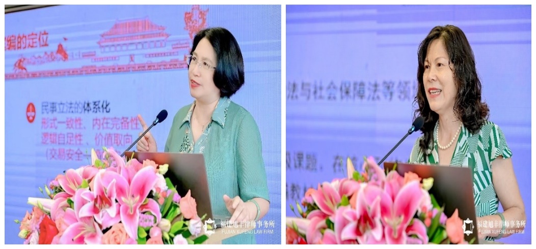 厦门大学法学院教授、厦门大学妇女/性别研究与培训基地常务副主任、中国法学会婚姻家庭法学研究会副会长蒋月报告《法律和社会约束下的婚姻家庭行为》。她依据《民法典》等相关法律规定,结合相关统计数据、司法判例等充分论述了“反家庭暴力与婚姻家庭文明”、“诚实信用与夫妻忠实”以及“父母关系的新规则”等问题。在该单元与谈环节,厦门市律师协会婚姻家庭与财富传承委员会主任、锦天城(厦门)律师事务所律师梁瑛,厦门市律师协会婚姻家庭与财富传承委员会副主任、福建旭丰律师事务所刘福来律师担任与谈嘉宾,与蒋月就夫妇忠实义务、平等原则问题进行了交流。厦门大学法学院教授、《厦门大学学报》(哲社版)编辑部主任、中国法学会婚姻家庭法学研究会常务理事何丽新跟大家分享的报告题目是《< 民法典婚姻家庭编司法解释一>中女性财产权保护问题思考》。何丽新教授评议解说了民法典体系化与婚姻家庭编的定位、婚姻契约论与女性财产权等内容,也司法实践中争议较多的“忠诚协议的财产性效力”问题阐明了其观点。福建旭丰律师事务所刁玫律师主持该单元与谈环节,并与厦门市律师协会婚姻家庭与财富传承委员会副主任卢玉琼律师一起,同何丽新交流讨论了女性财产权保护问题。