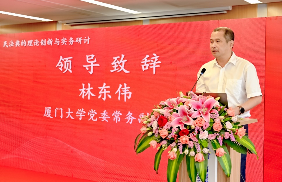 厦门大学党委常务副书记林东伟首先为本次论坛致辞。他表示本次活动在《民法典》颁布两周年的重要节点举办,为进一步推动《民法典》的实施宣传营造了良好的环境和社会氛围,并提出了五点建议:一是突出学习宣传习近平法治思想;二是要发挥厦门大学法学学科优势与专业背景,加强理论研究,推动民法典不断完善与发展;三是创新民法典宣传形式,推进民法典学习宣传常态化;四是深入宣传民法典在保障人民群众合法权益、促进社会主义市场经济繁荣发展方面发挥的重大作用;五是引导广大师生和居民群众更加注重家庭、家教、家风。
