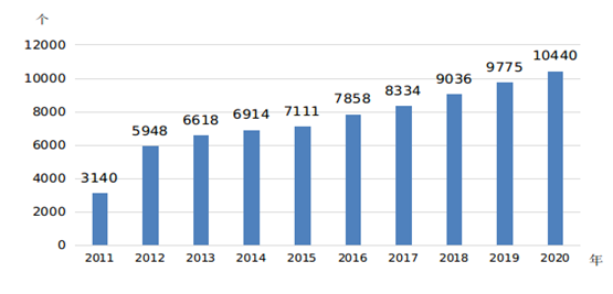 3.残疾儿童康复服务水平显著提升。《纲要》实施以来,国家先后实施残疾儿童抢救性康复项目、残疾儿童康复救助制度,目前全国残疾儿童康复救助政策体系、工作体系和服务网络全面建立,为开展残疾儿童康复救助提供了有力保障。截至2020年底,全国开展残疾儿童康复的残疾人康复机构10440个(见图6),比2011年增加7300个。2020年,全国共有23.7万名0—6岁残疾儿童接受了基本康复服务,比2016年[6]增加8.7万人,接受基本康复服务的残疾人中0—6岁残疾儿童比重为2.2%。