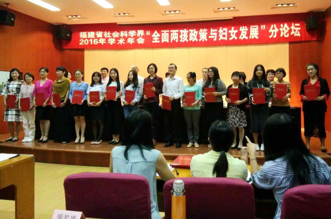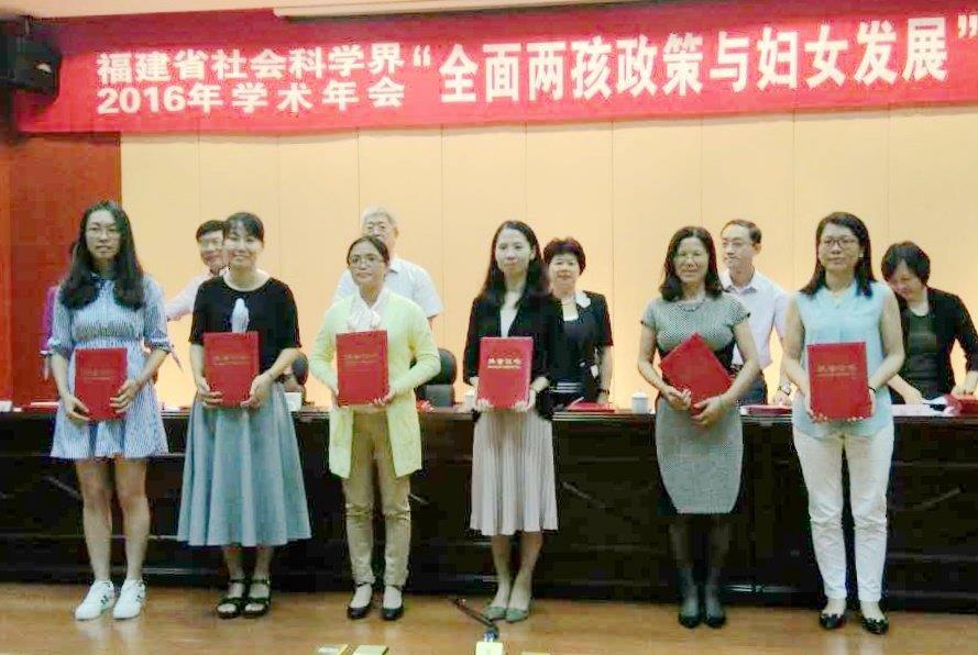 我校妇女/性别研究培训基地副主任、法学院教授、博士生导师蒋月及论文获奖师生应邀请出席大会。蒋月教授做了“落实福建省新的法定产假和待遇给付保障调查研究”的大会发言,受到了与会者的一致赞赏。在会上,来自北京大学等高校的妇女研究工作者也纷纷发言,围绕两孩政策的由来、两孩生育成本、两孩政策对妇女的影响等议题进行深入交流。在此次研讨会征文中,我校共有四篇论文获奖。其中石红梅、任艳青《人力资本、社会资本与高校毕业生的就业质量》获一等奖,哲学系博士生左兴玲《女性在科技领域中代表不足的系统性限制解析》获二等奖,中文系博士生王怀昭《中国现代女作家强暴叙事与意义》、刘艳杰、任艳青《女大学生就业问题研究——基于职业生涯发展的视角》获三等奖。
