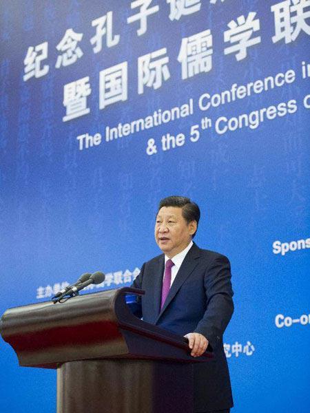 2014年9月24日,习近平出席纪念孔子诞辰2565周年国际学术研讨会暨国际儒学联合会第五届会员大会开幕会并发表讲话。
