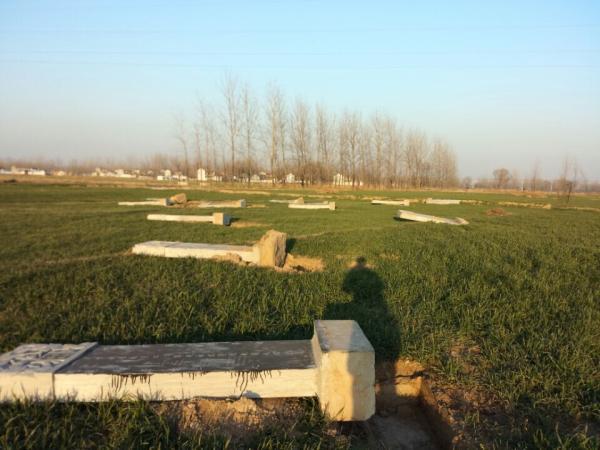 2014年12月,沛县安国镇一片农田上,12块墓碑放倒在地。 澎湃新闻记者 蓝天彬 图