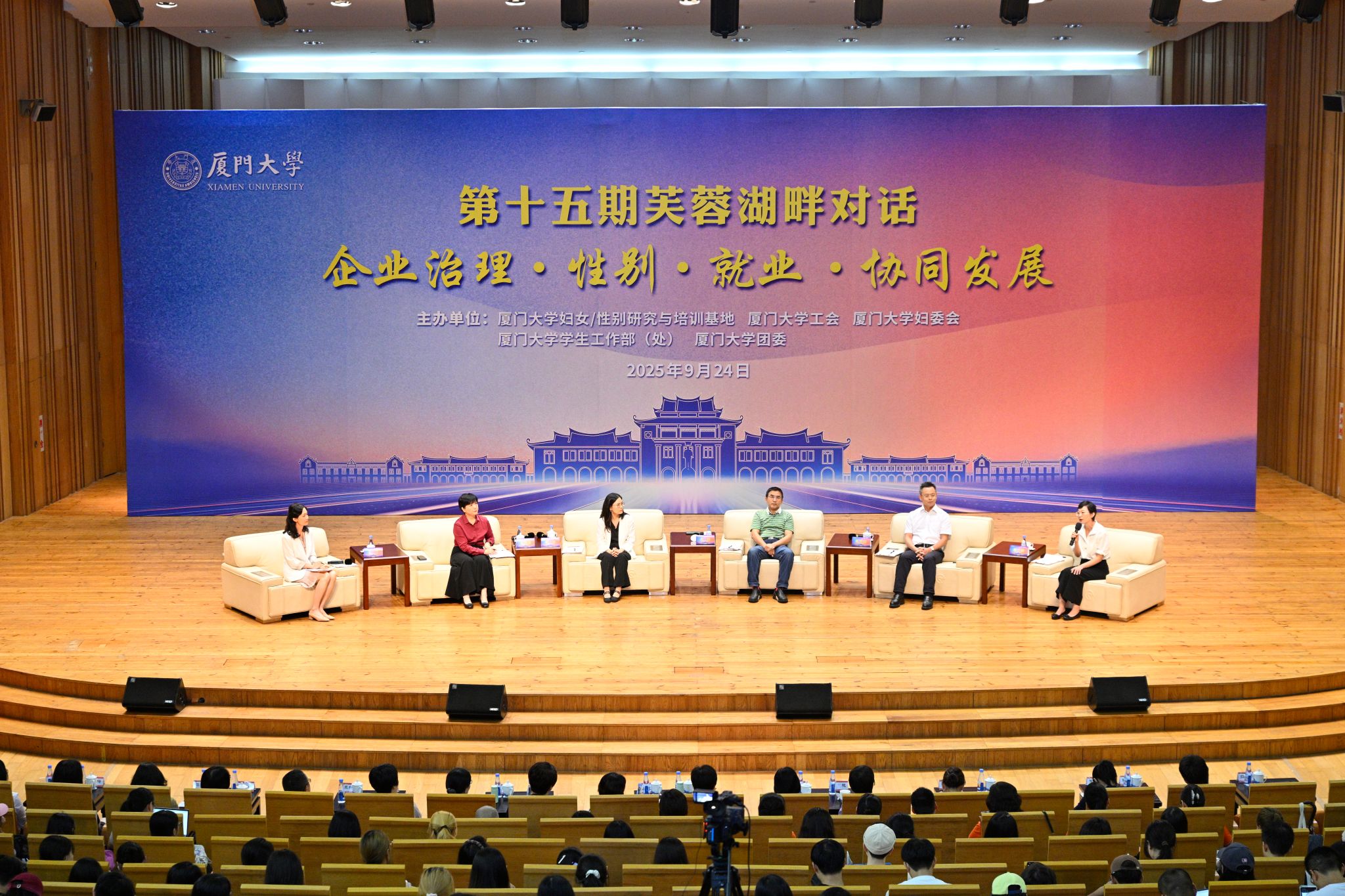 9月24日晚,以“企业治理.性别.就业.协同发展”为主题的第十五期芙蓉湖畔对话在厦门大学科学艺术中心二楼音乐厅举行。厦门大学校务委员会副主任、校妇女/性别研究与培训基地主任、老年大学校长邓朝晖,厦门大学社科处处长潘越教授,部分学院、机关部处、群团的负责人,来自不同学院的师生代表共480余人参与活动。